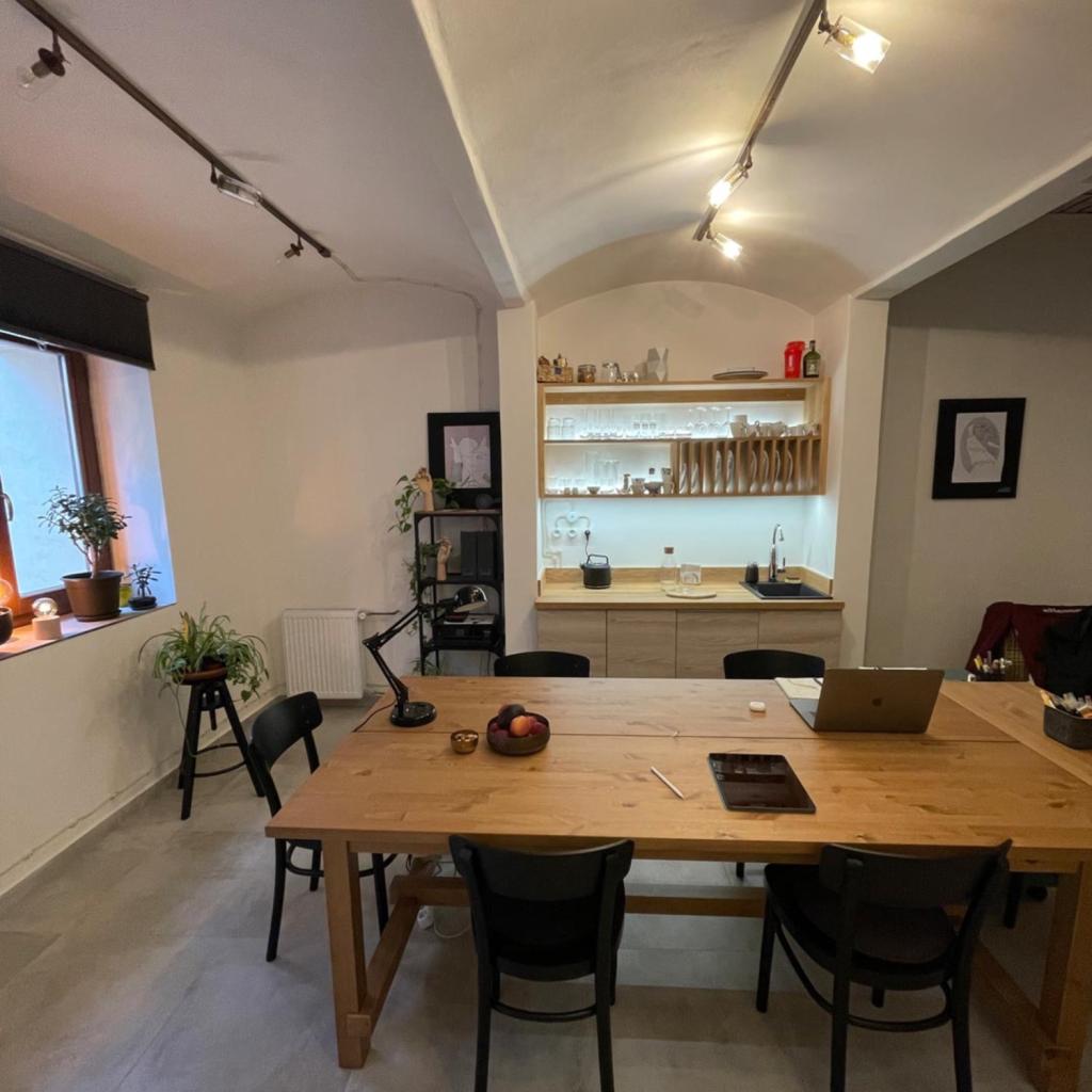 Projekt se zaměřil na vytvoření interiéru studia v suterénu historického domu, nacházejícího se v jedné z nejstarších částí města. Hlavní myšlenkou bylo respektovat historickou hodnotu prostoru a jeho původní charakter, přičemž jsme se snažili o nenásilnou integraci moderních prvků, které podpoří přirozenou atmosféru místa. Při návrhu interiéru jsme se soustředili na zachování autenticity a integrity historických prvků, přičemž kladli důraz na světlou barevnou paletu, která prostor opticky zvětšuje a prosvětluje. Cihlové zdi byly ponechány v původním stavu, čímž se zachovala jejich textúra a historický nádech. Tento kontrast mezi přírodními materiály a moderními doplňky vytváří harmonické spojení minulosti a současnosti. Prostor je zařízen s využitím přírodních materiálů, jako je dřevo a kámen, které nejen podtrhují estetickou hodnotu interiéru, ale také přispívají k jeho příjemné atmosféře a ekologickému charakteru. Dřevěné detaily, ať už v podobě nábytku nebo obkladů, dodávají interiéru teplo a útulnost, zatímco kamenné prvky vnášejí do prostoru robustnost a trvalou eleganci. Projekt je příkladem citlivé adaptace historického prostoru na moderní využití, která respektuje minulost a zároveň ji přetváří pro současné potřeby, aniž by ztratila svůj původní charakter a kouzlo.