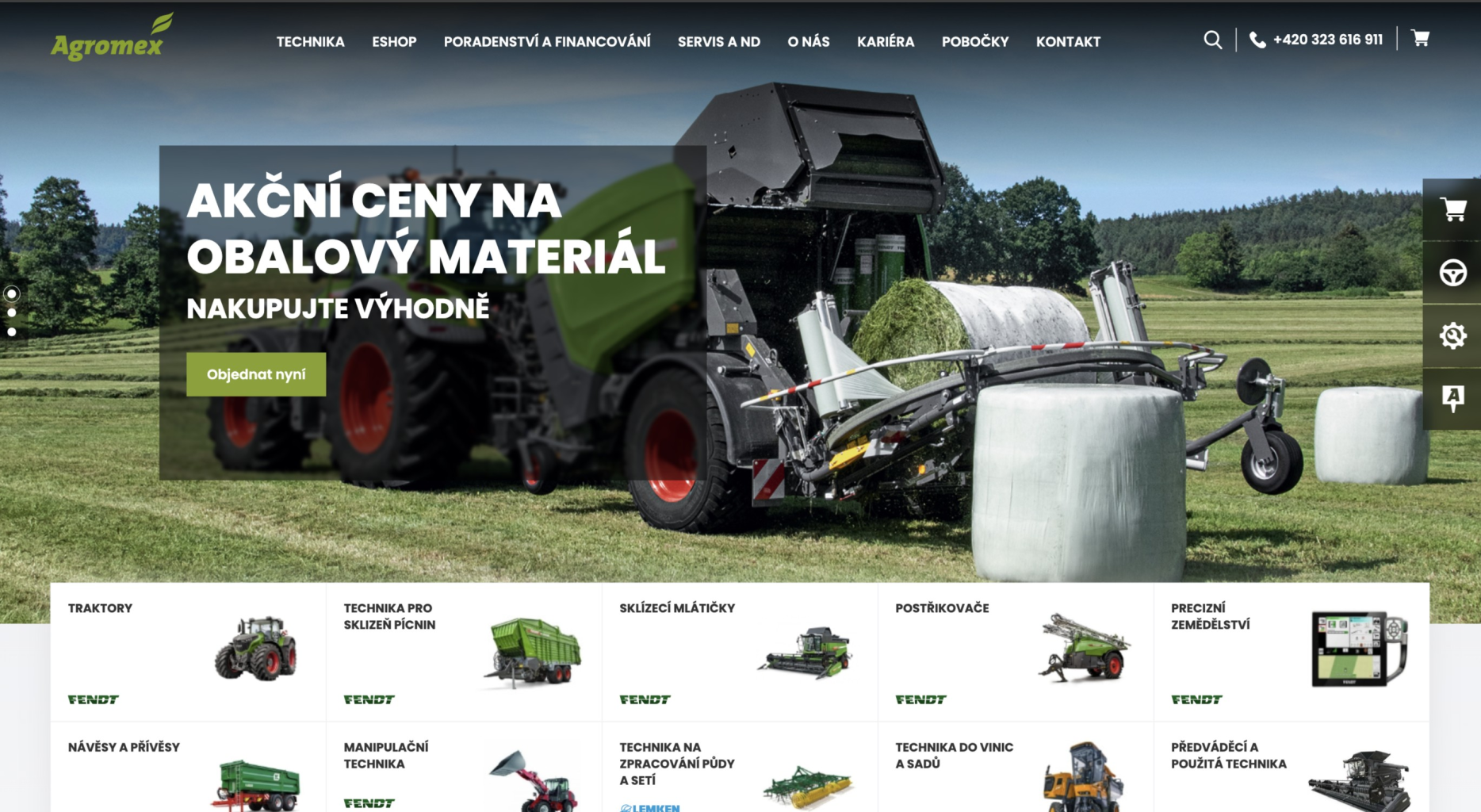Společnost Agromex, která se zabývá prodejem a servisem zemědělských strojů a zahradní techniky se rozhodla inovovat celé své webové řešení včetně e-shopu. Na webu se promítá kompletně nová struktura jak zemědělské techniky, tak veškerých poboček s jejich zaměstnanci. Pro klienta jsme posléze nasazovali i intranetové řešení.